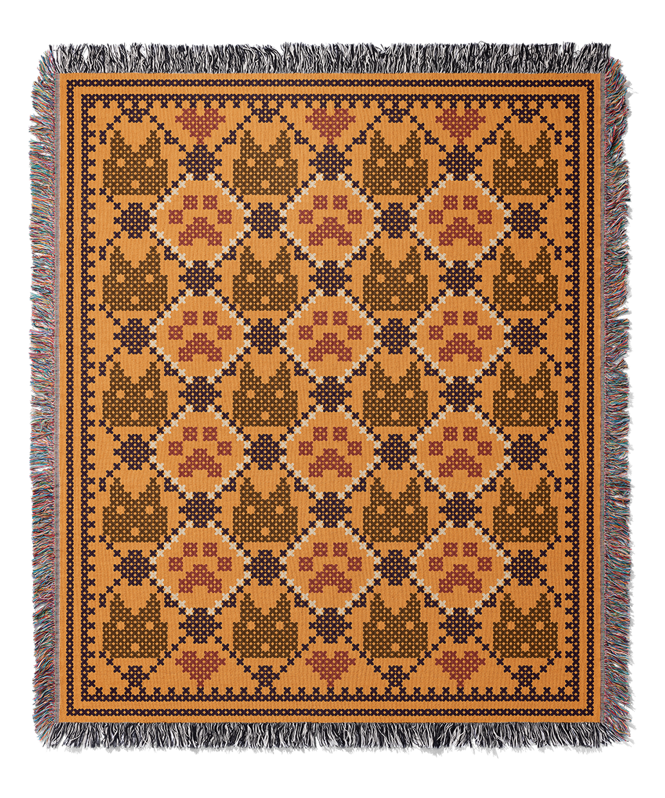 This charming throw blanket features an adorable repeating pattern of cat heads and paws, designed to delight feline enthusiasts and add a touch of whimsy to any room. The geometric repetition creates a fascinating rhythm, reminiscent of traditional cross-stitch patterns, while the pixelated style gives it a contemporary edge.